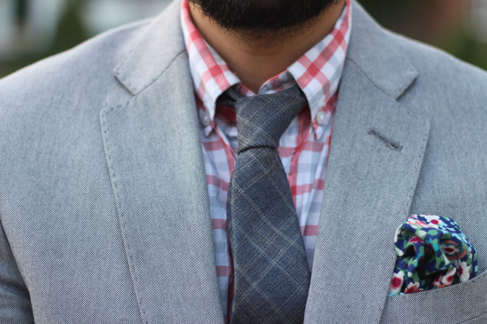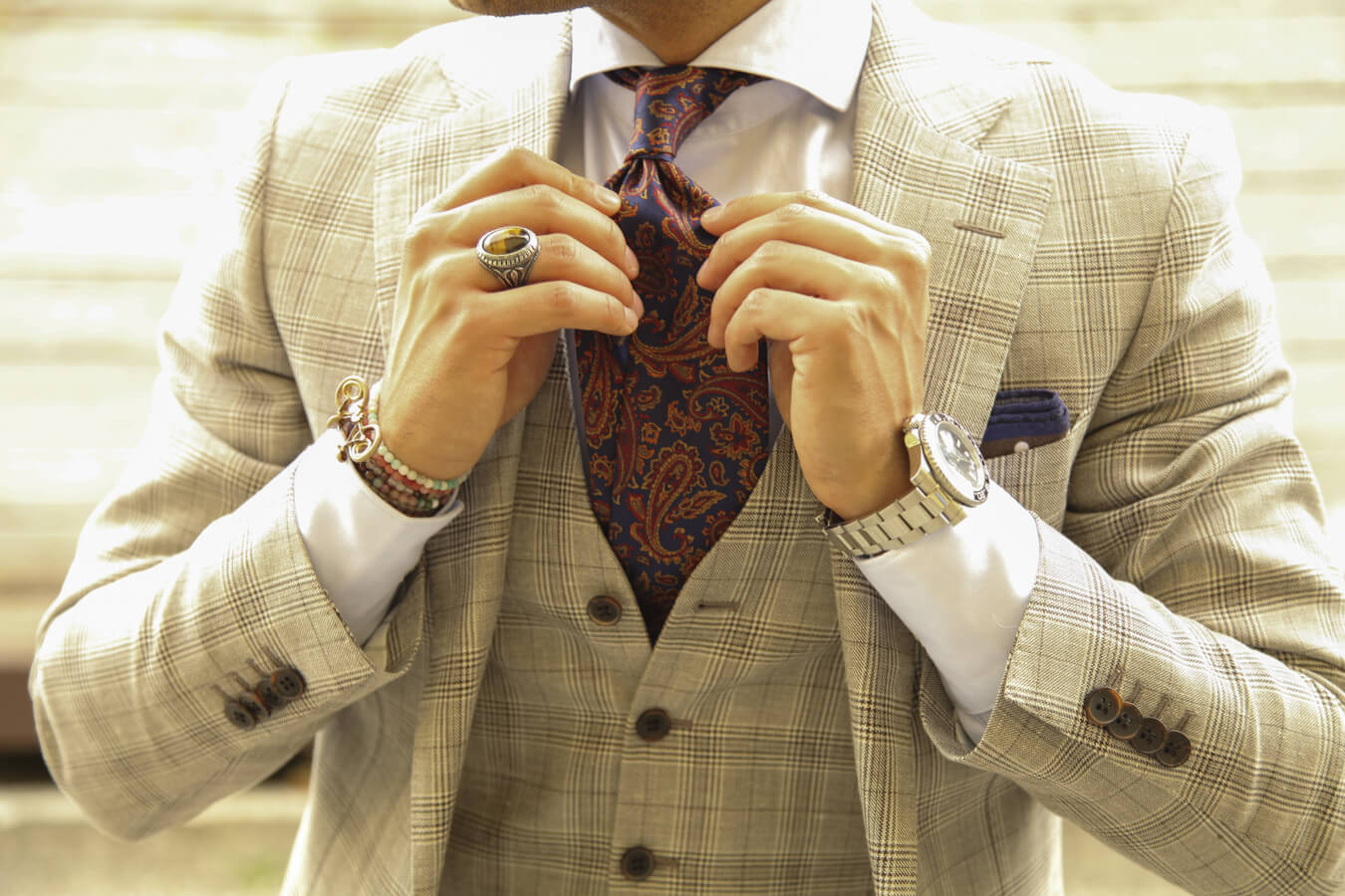 - Узорчатый костюм: если костюм имеет узор, то галстук должен быть однотонным и сочетаться с одним из цветов узора.