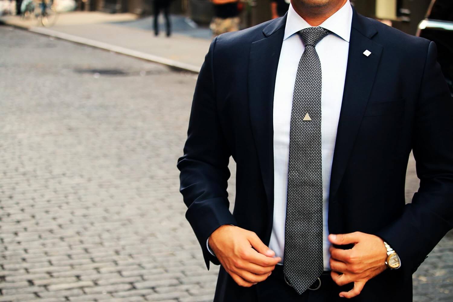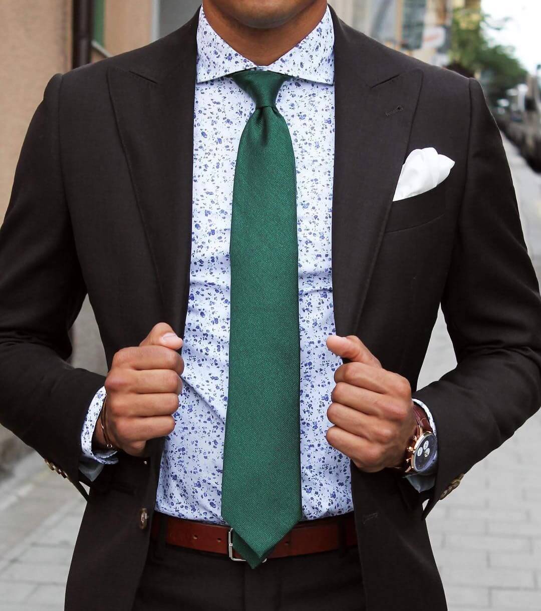 - Сочетайте галстук с цветом костюма: галстук должен быть на тон темнее или светлее цвета вашего костюма. Если костюм однотонный, галстук может быть с узором или принтом.